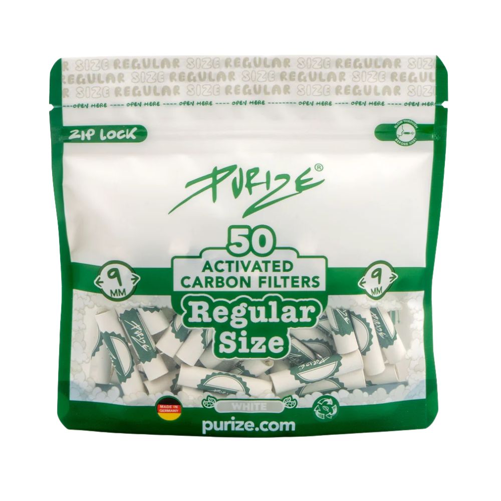 PURIZE Regular Size Aktivkohlefilter 9 mm – 50 Stück im PE-Beutel, Weiß